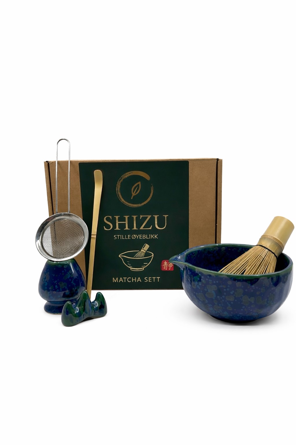 Inneholder matcha-bolle (chawan), matcha-visp (chasen), matcha-skje (chashaku), sil, samt holdere til visp og skje.
